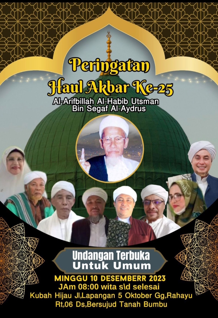Tanah Bumbu – Dalam momentum bersejarah Haul Akbar ke-25 Al-Arifbillah Al-Habib Usman Bin Segaf Al-Aydrus, umat Islam dipersilakan untuk merayakan dengan khidmat dan kehangatan. Acara terbuka untuk seluruh masyarakat dan dijadwalkan pada hari Minggu, 10 Desember 2023, dimulai pukul 08.00 hingga selesai, di Kubah Hijau, Jalan Lapangan 5 Oktober, Gang Rahayu RT.06 Desa BerSujud, Kecamatan Simpang Empat, Kabupaten Tanah Bumbu.(9/12/2023)