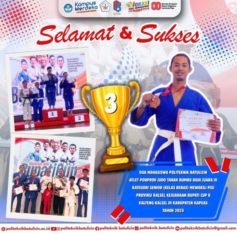 Kapuas –PeloporNews Kalimantan -Dua mahasiswa Politeknik Batulicin berhasil mengukir prestasi gemilang di ajang Kejuaraan Judo Bupati Cup 2, yang digelar pada 22-24 Agustus 2025 di Aula Rumah Jabatan Bupati Kapuas. Mereka meraih Juara III di kategori senior, mengharumkan nama Tanah Bumbu di tingkat regional Kalimantan Tengah dan Kalimantan Selatan.