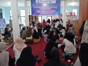 “Kalau bosan, ayo datang ke perpustakaan! Di sini bisa membaca, bermain, dan belajar bersama teman-teman,” ujar Kak Tia penuh semangat, disambut sorak dan tawa anak-anak yang antusias mendengarkan.