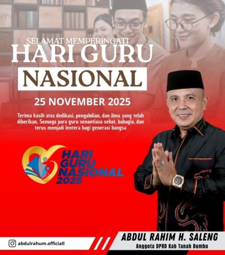 Peringatan Hari Guru Nasional 2025 menjadi momentum istimewa bagi Anggota DPRD Kabupaten Tanah Bumbu, Abdul Rahim H. Saleng, untuk menyampaikan penghargaan setinggi-tingginya kepada para pendidik yang telah berperan penting dalam mencerdaskan kehidupan bangsa.