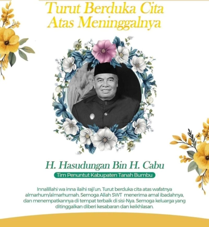 Wakil Ketua I DPRD Kabupaten Tanah Bumbu, H. Hasanuddin Murat, Am.S.Ag., M.A., menyampaikan belasungkawa yang mendalam atas wafatnya almarhum. Ia menyebut H. Hasudungan sebagai figur sentral yang memiliki peran penting dalam sejarah perjuangan daerah.